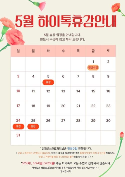 *5/5(화), 5/24(일),5/25(월) 에는 하이톡의 모든 수업이 진행되지 않습니다.