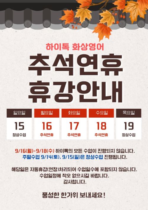 주말수업 9/14(토), 9/15(일)은 정상수업 진행됩니다.