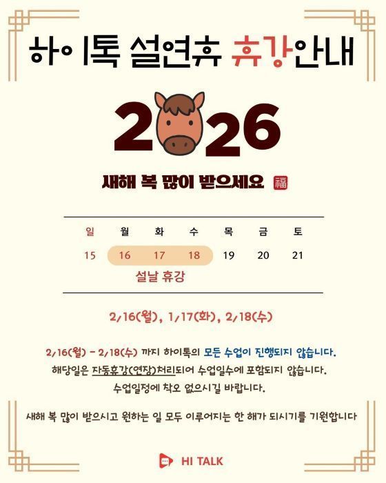 2/16(월) - 2/18(수) 까지 하이톡의 모든 수업이 진행되지 않습니다.